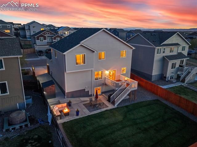 Stunning mountain and sunset views, rare extended parking, and over $25,000 in custom concrete upgrades set this home apart. This pristinely maintained property offers 4 bedrooms, 2.5 bathrooms, and an expansive 860 sq ft unfinished garden-level basement with room to grow. The bright two-story entry opens to an inviting open floor plan with engineered hardwood floors, seamlessly connecting the living and dining areas. The kitchen features quartz countertops, stainless steel appliances, a large center island, and modern cabinetry. Step outside to the composite deck to take in breathtaking Pikes Peak, Front Range, and open-space views, along with unforgettable Colorado sunsets and weekend hot air balloons. The standout feature is the extensive, low-maintenance custom concrete work offering exceptional functionality and flexibility. The expanded driveway provides additional parking and continues through custom French gates to a fully extended side-yard concrete area—ideal for securely storing vehicles, trailers, boats, campers, or RVs. The concrete continues into the backyard with both ramp and step access to a large, fully finished patio perfect for entertaining or relaxing. This versatile outdoor space accommodates a hot tub, outdoor dining, grilling, fire pit, or lounge seating, and extends under the deck to provide covered outdoor living for year-round use. The 3-car tandem garage includes a permitted Tesla EV charger and built-in shelving. Additional upgrades include a smart thermostat, new dusk-to-dawn exterior lighting, whole-house humidifier, water softener, and a new Class 4 roof installed in 2025. Upstairs, the primary suite features vaulted ceilings, a 5-piece ensuite, and a walk-in closet. Three additional bedrooms, a full bath, and a convenient laundry room complete the upper level. A rare combination of views, upgrades, parking flexibility, and outdoor living—schedule your showing today!